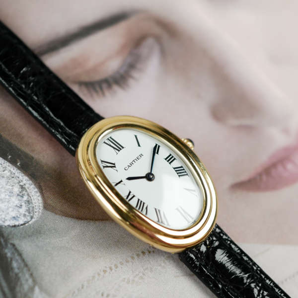 Créée dans les années 1950, la ligne Baignoire tient son nom de sa forme elliptique rappelant une baignoire ancienne. Cartier pousse ici l’audace plus loin avec ce boîtier à double rang : deux cercles concentriques en or qui captent magnifiquement la lumière. Ce détail, rare et recherché, donne à la montre une présence bien plus affirmée au poignet que ses dimensions pourraient laisser croire.