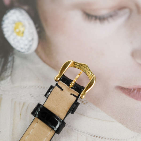 La montre vient avec sa boucle ardillon en or jaune 18 carats et sa boite d’origine.