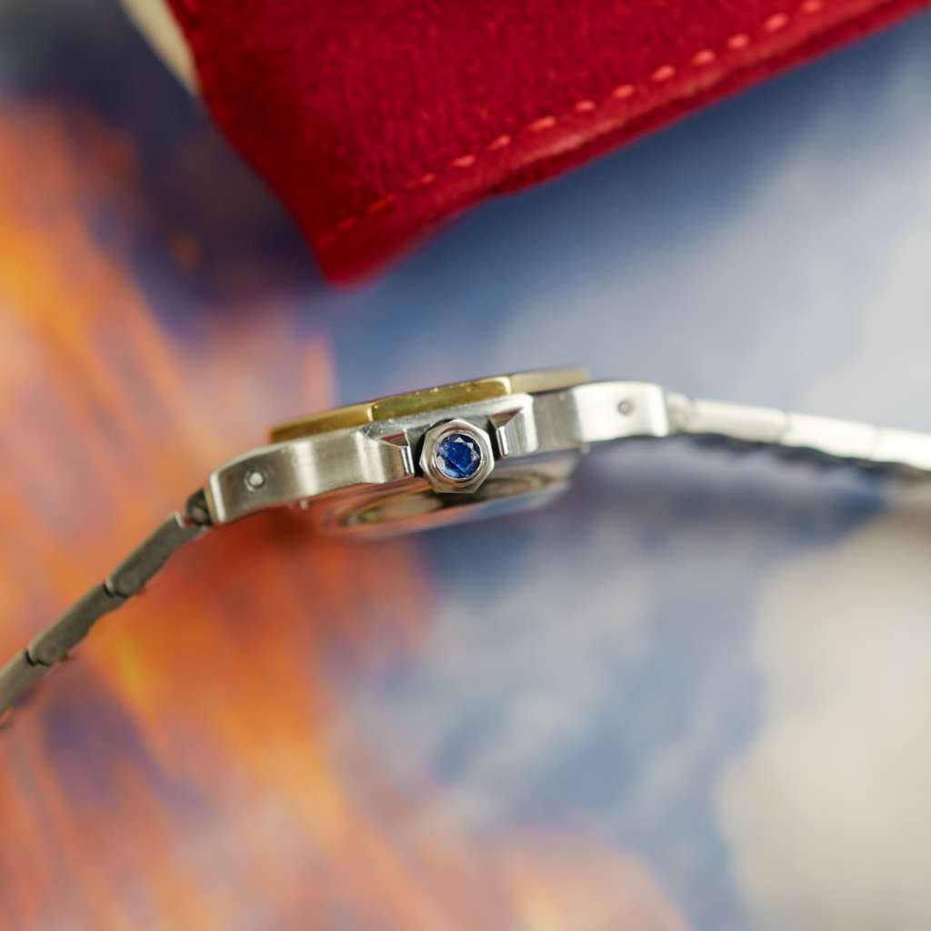 Le cadran blanc laqué, aux chiffres romains bien marqués, affiche un équilibre parfait. Les aiguilles bleuies et le chemin de fer intérieur soulignent l’inspiration classique du modèle. La couronne cannelée, sertie d’un cabochon bleu, reste fidèle à l’ADN Cartier.