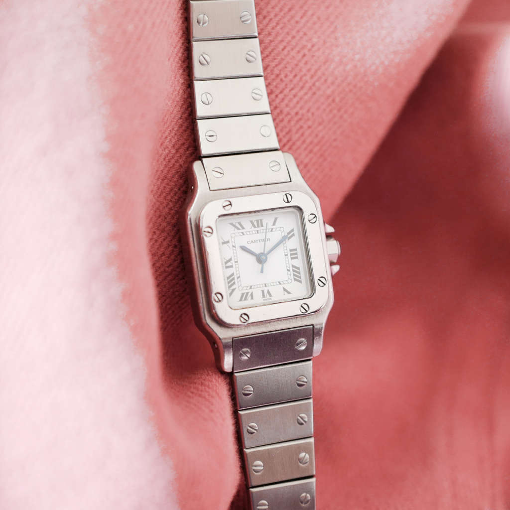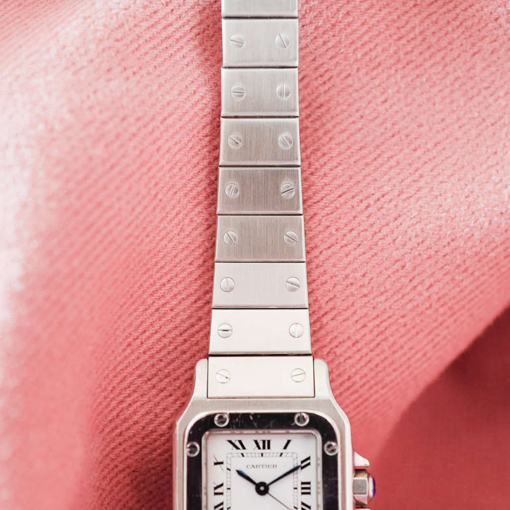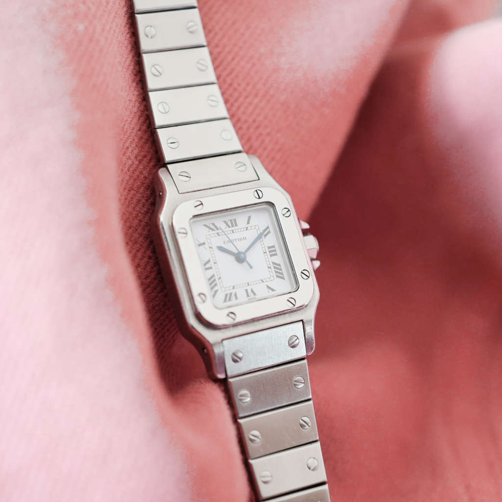 - Il s’agit de l’emblématique modèle Cartier Santos interprété pour habiller les poignets féminins.