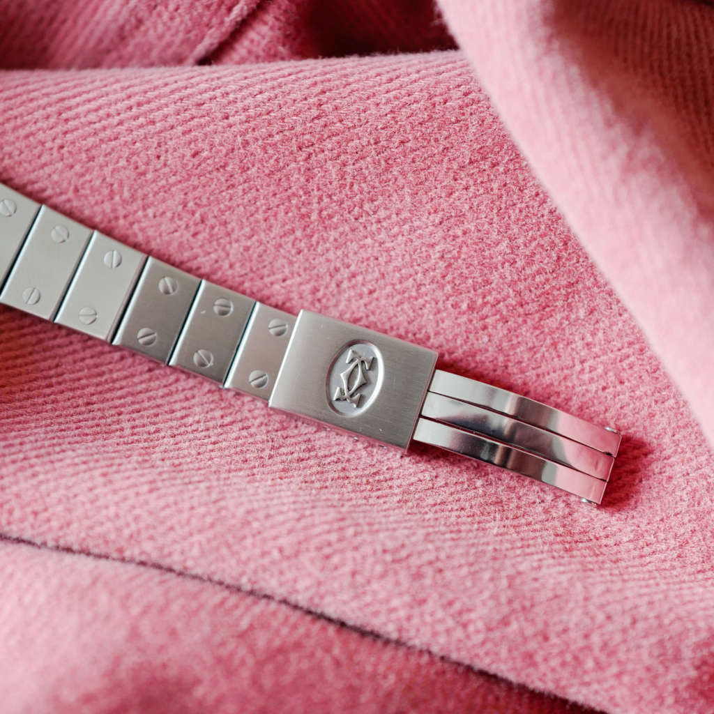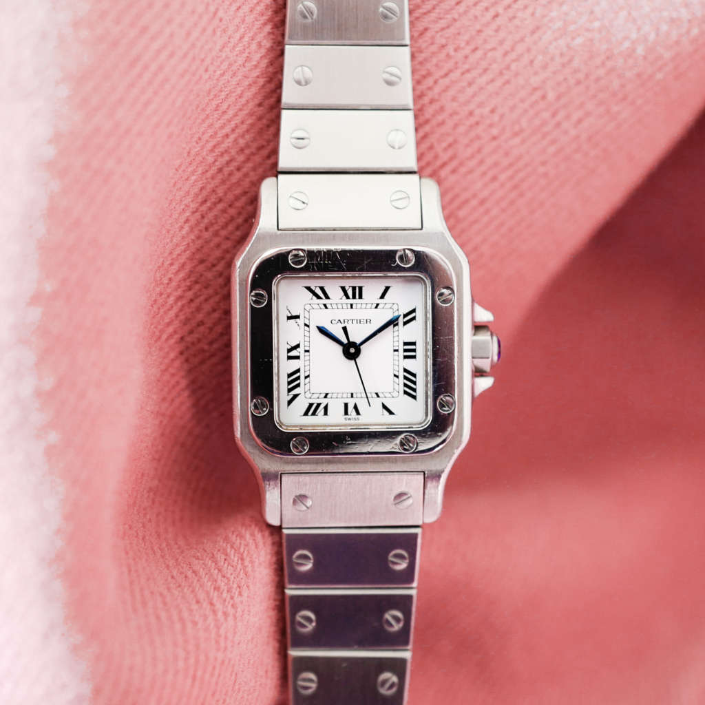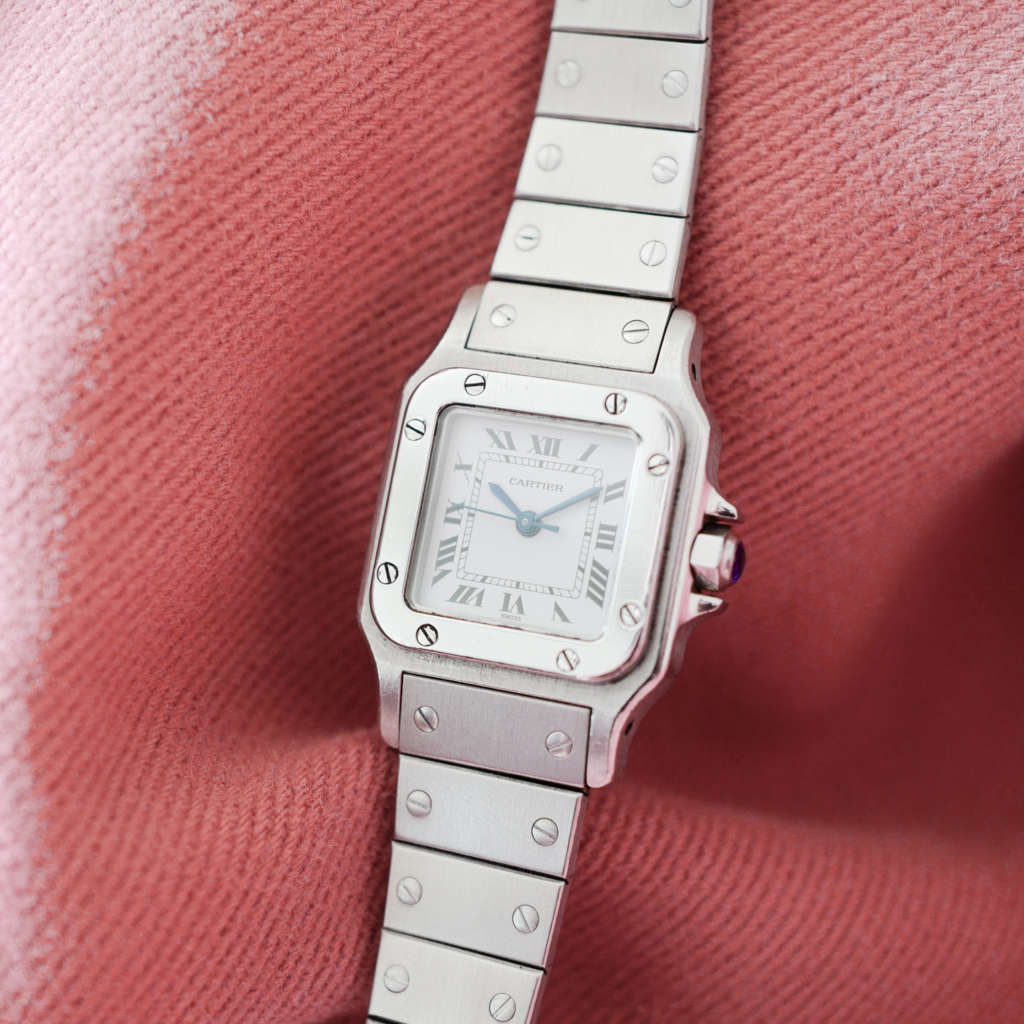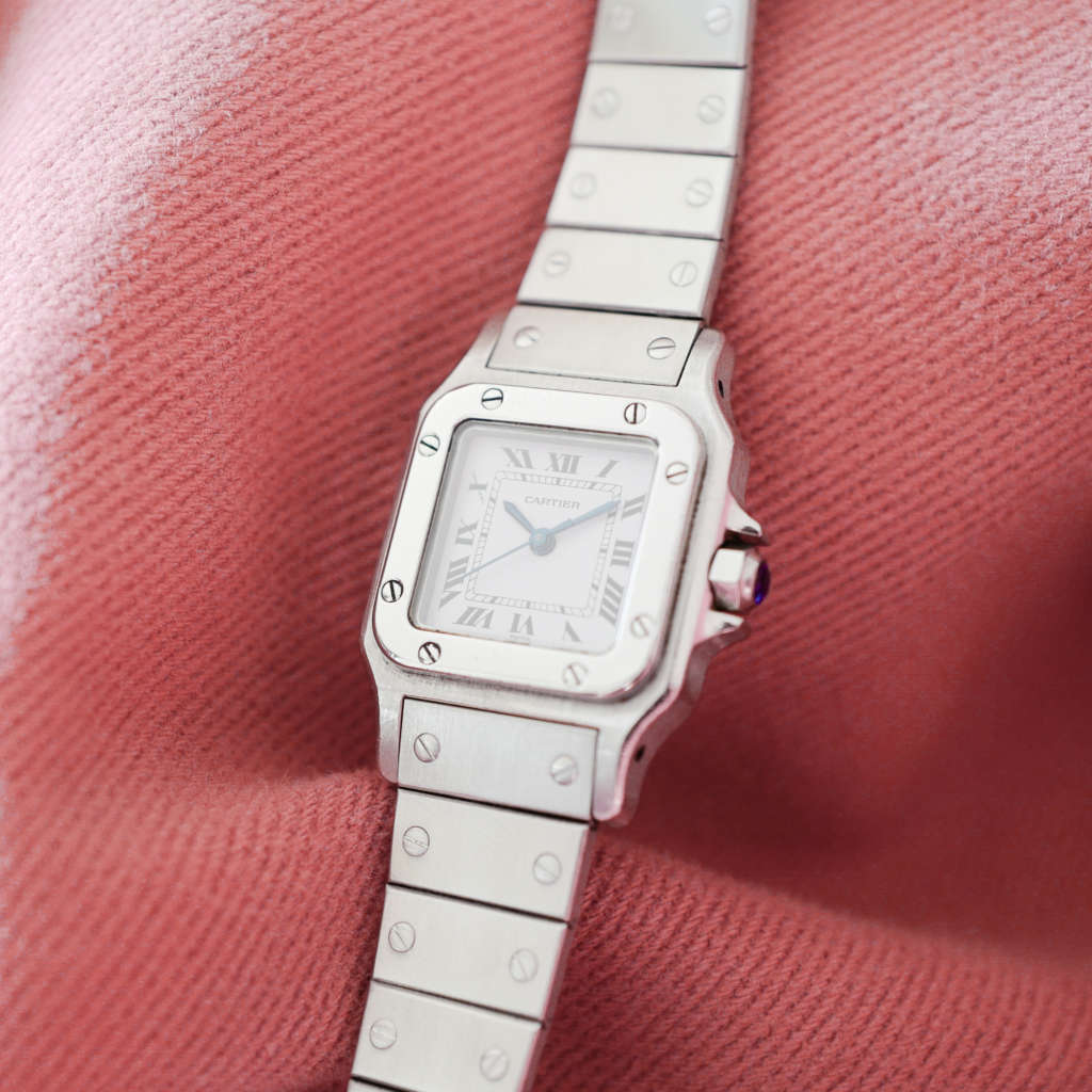 - Il s’agit de l’emblématique modèle Cartier Santos interprété pour habiller les poignets féminins.