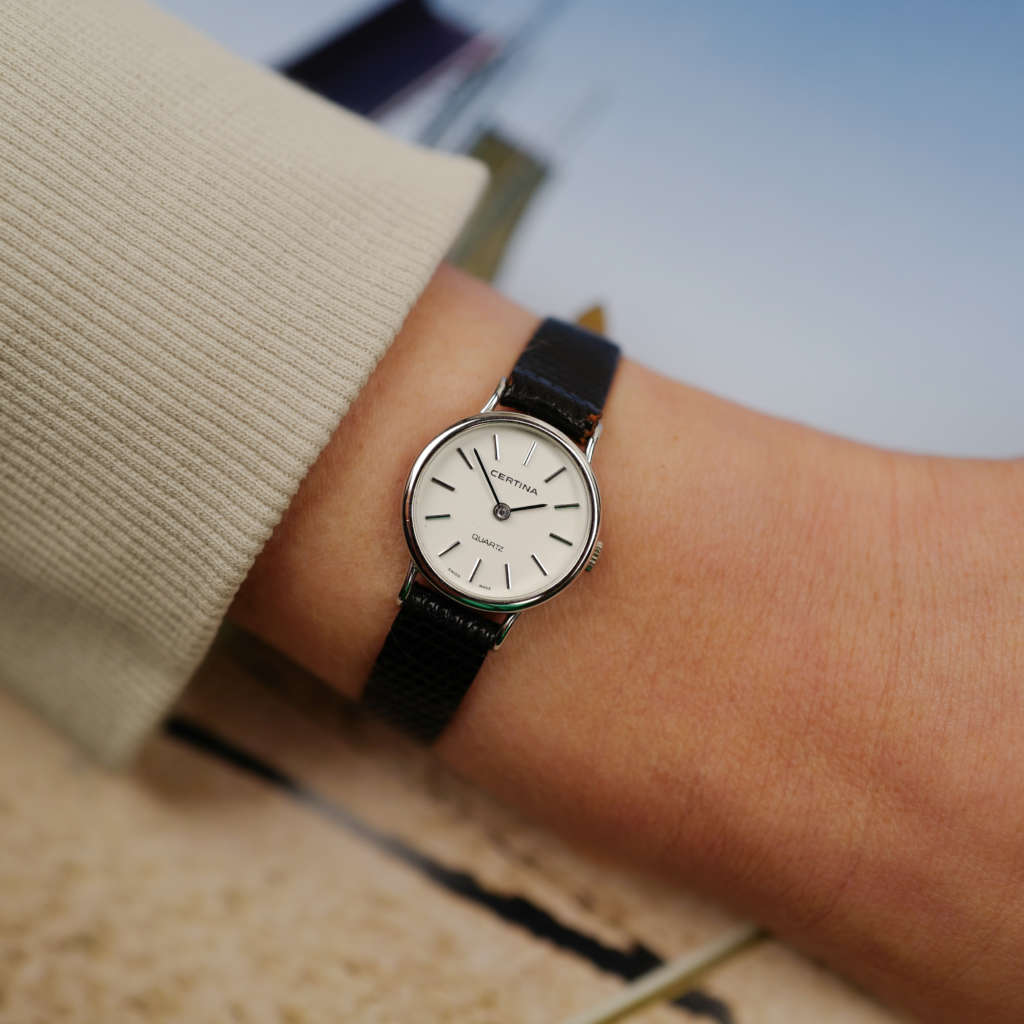 CERTINA Quartz « Mini-Montre sur cuir noir » pour femme (Vintage 1980)