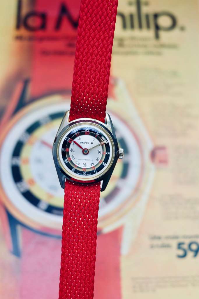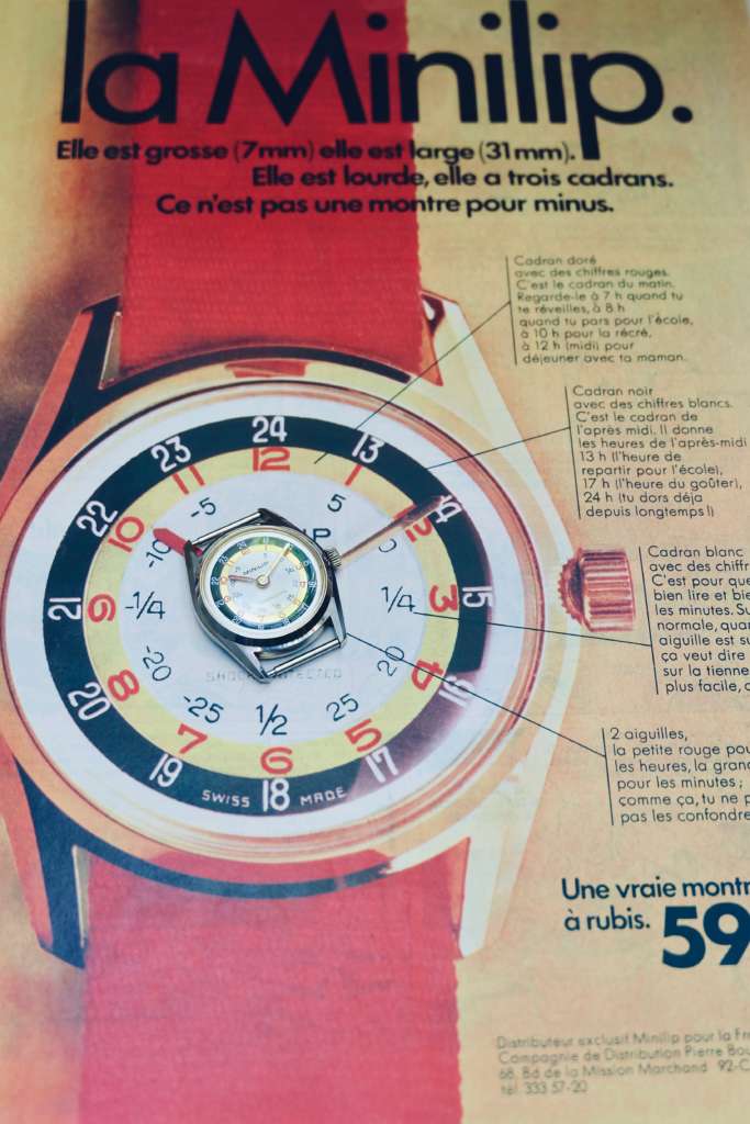 Cette montre est l’un des grand classique de la Maison d’Horlogerie Française Lip. Dans les années 1970, Lip lance la Minilip. C’est une vértiable montre pédagogique pour les enfants animée par un mouvement Suisse mécanique au remontage manuel.