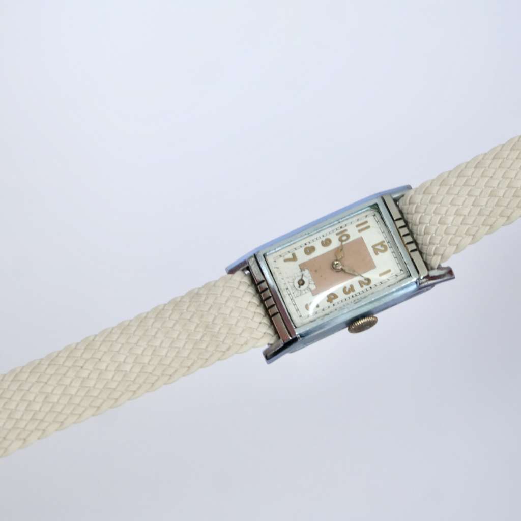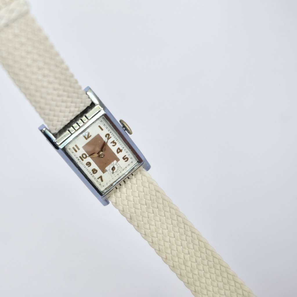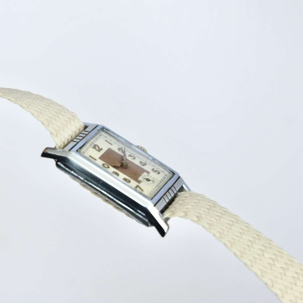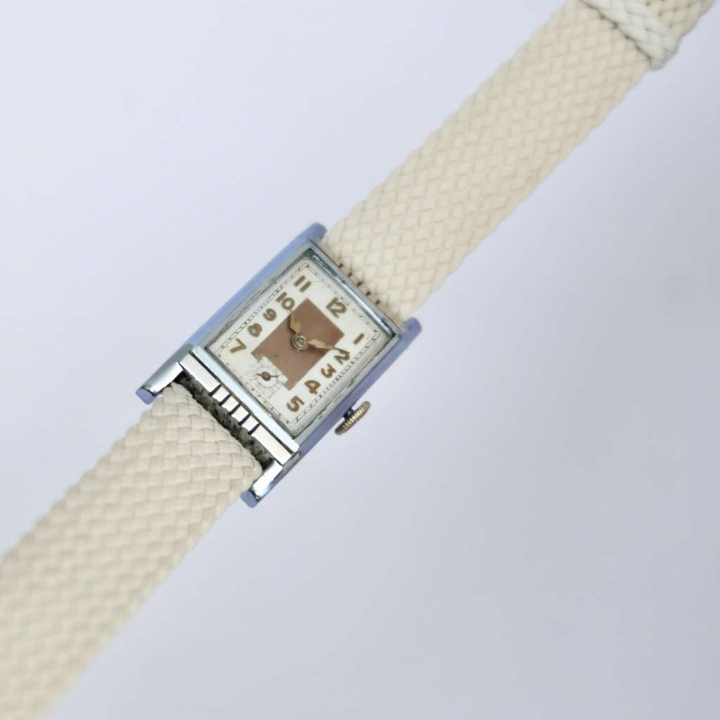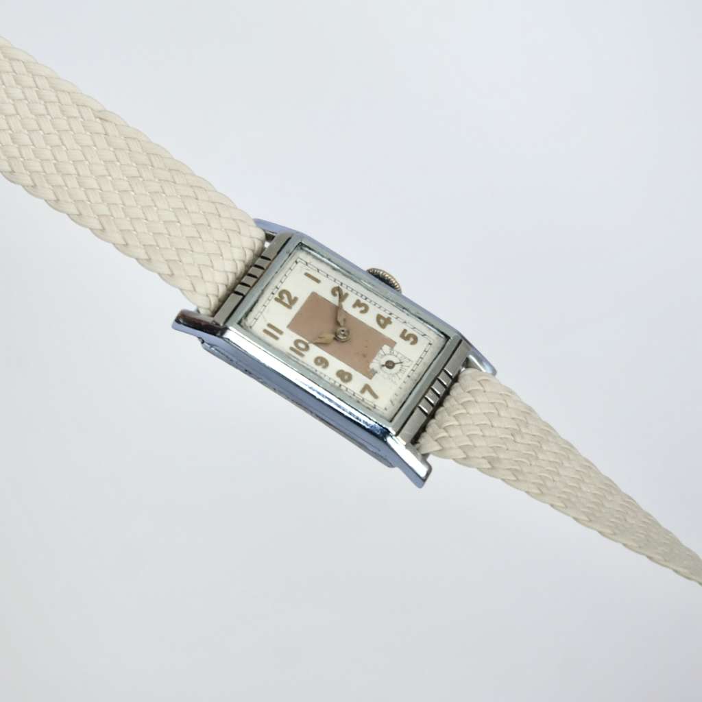C’est celle-ci que nous voulions !  A premier regard nous avons été séduit par le style résolument Art-Déco de cette montre rectangulaire vintage. Cela la replace tout de suite dans son contexte : voici une montre de l’après-guerre, une montre qui a vu le jour dans une Europe nouvellement stable et confiante en l’avenir.