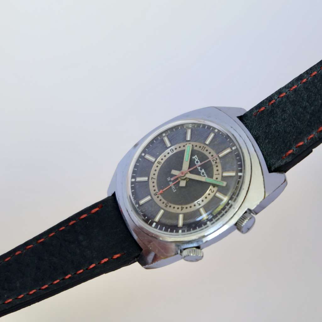 Cette montre est mécanique à remontage manuel de confection soviétique très robuste. Ce mouvement date des années 1950 et possède une alarme mécanique à usage militaire. Il suffit de le remonter pour le faire sonner et vibrer. Attention, son fonctionnement est addictif !