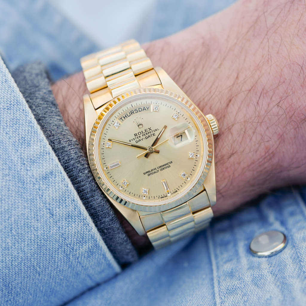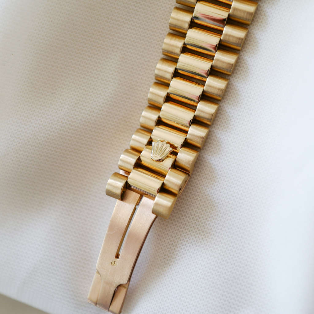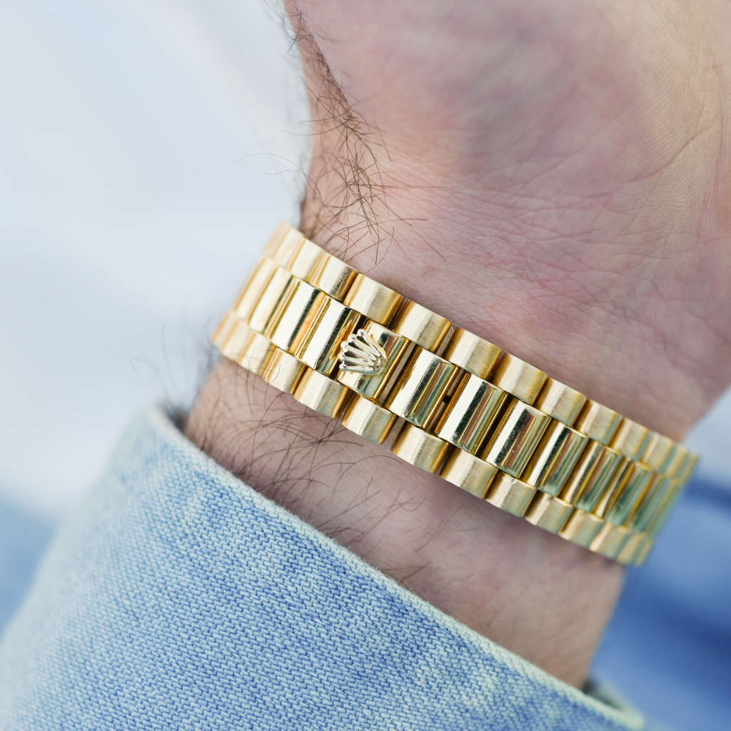 - Dans cette version en or jaune 18 carats et bracelet président en acier, il s’agit d’une véritable icône.